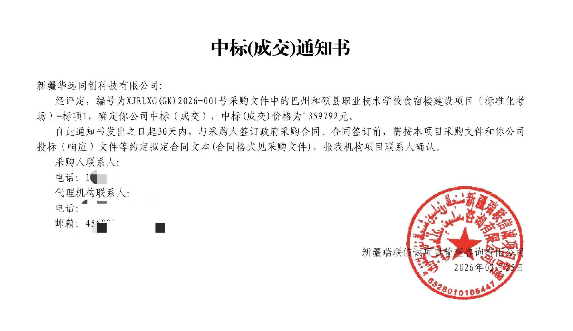 2026年2月25日,新疆華遠(yuǎn)同創(chuàng)科技有限公司中標(biāo)巴州和碩縣職業(yè)技術(shù)學(xué)校食宿樓建設(shè)項(xiàng)目(標(biāo)準(zhǔn)化考場(chǎng)),順利斬獲新年第一標(biāo),贏得開門紅,為公司深耕新疆教育信息化建設(shè)再添新篇章!